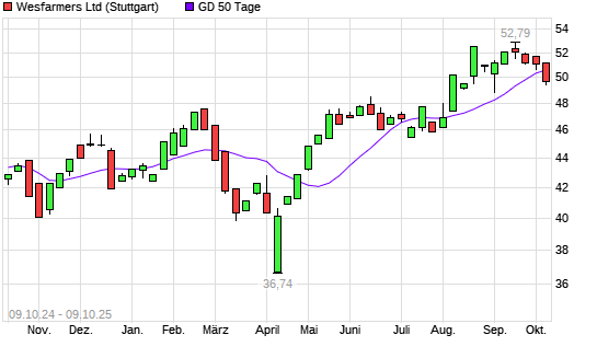 Mit dem Rücksetzer auf 49,75 EUR hat die Wesfarmers-Aktie am 08.10.2025 die 50-Tage-Linie nach unten gekreuzt.