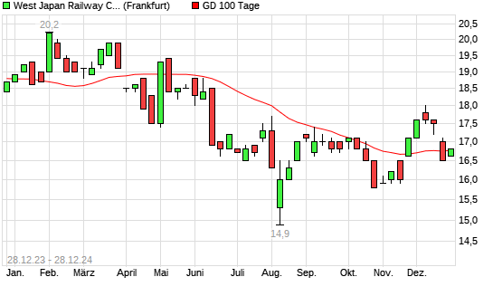 Mit dem Anstieg auf 16,80 EUR hat die West Japan Railway-Aktie am 27.12.2024 die 100-Tage-Linie nach oben gekreuzt.