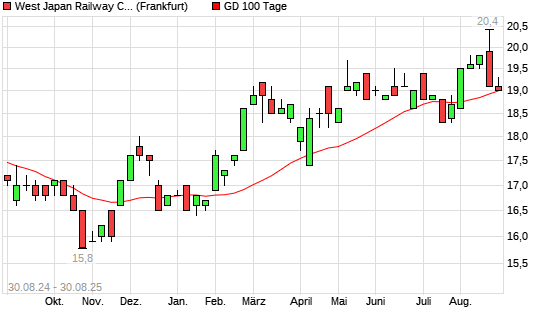 Mit dem Rücksetzer auf 19,00 EUR hat die West Japan Railway-Aktie am 29.08.2025 die 100-Tage-Linie nach unten gekreuzt.