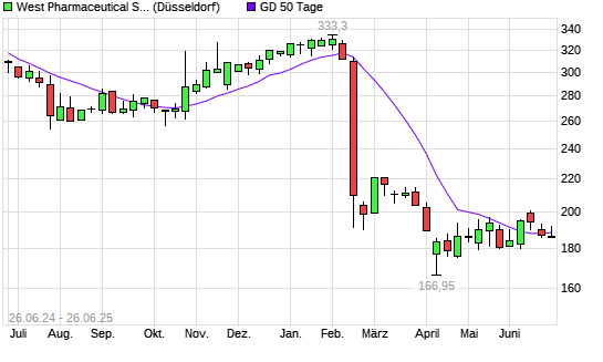 Mit dem Anstieg auf 190,20 EUR hat die West Pharmaceutical Services-Aktie am 25.06.2025 die 50-Tage-Linie nach oben gekreuzt.