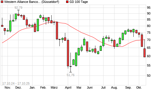 Mit dem Rücksetzer auf 67,34 EUR hat die Western Alliance-Aktie am 16.10.2025 die 100-Tage-Linie nach unten gekreuzt.