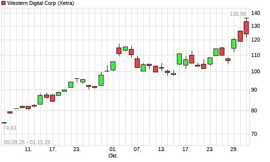 Mit dem Anstieg auf 129,74 EUR hat die Western Digital-Aktie (ISIN US9581021055) am 31.10.2025 ein neues All-Time-High erreicht und damit den Kurs vom 29.10.2025 eingestellt.