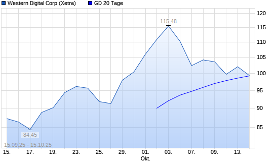 Mit dem Rücksetzer auf 97,46 EUR hat die Western Digital-Aktie am 14.10.2025 die 20-Tage-Linie nach unten gekreuzt.