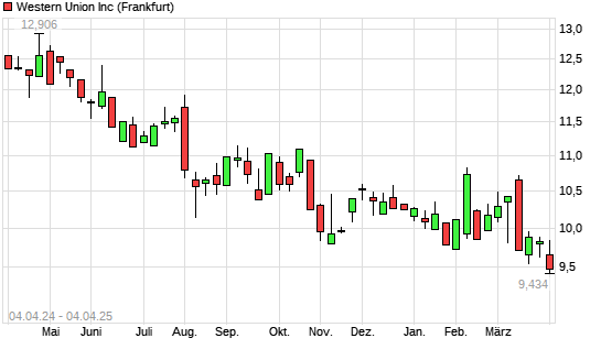 Mit dem Rücksetzer auf 9,53 EUR hat die Western Union-Aktie (ISIN US9598021098) am 03.04.2025 ein neues 12-Monats-Tief erreicht und damit den Kurs vom 25.03.2025 eingestellt.