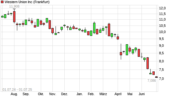 Mit dem Rücksetzer auf 7,11 EUR hat die Western Union-Aktie (ISIN US9598021098) am 30.06.2025 ein neues All-Time-Low erreicht und damit den Kurs vom 27.06.2025 eingestellt.