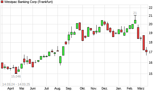 Mit dem Rücksetzer auf 16,70 EUR hat die Westpac Banking-Aktie (ISIN AU000000WBC1) am 13.03.2025 ein neues 6-Monats-Tief erreicht und damit den Kurs vom 07.03.2025 eingestellt.