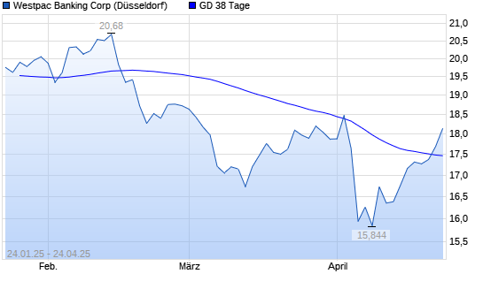 Mit dem Anstieg auf 17,73 EUR hat die Westpac Banking-Aktie am 23.04.2025 die 38-Tage-Linie nach oben gekreuzt.