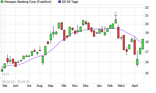 Mit dem Anstieg auf 17,88 EUR hat die Westpac Banking-Aktie am 24.04.2025 die 50-Tage-Linie nach oben gekreuzt.