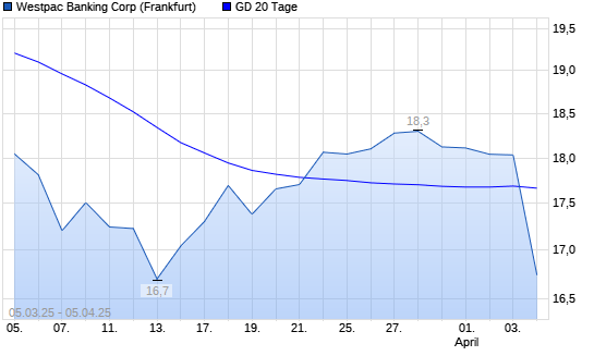 Mit dem Rücksetzer auf 16,74 EUR hat die Westpac Banking-Aktie am 04.04.2025 die 20-Tage-Linie nach unten gekreuzt.