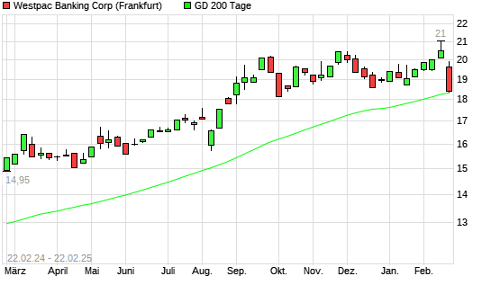 Mit dem Rücksetzer auf 18,39 EUR hat die Westpac Banking-Aktie am 21.02.2025 die 200-Tage-Linie nach unten gekreuzt.