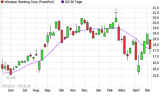 Mit dem Rücksetzer auf 17,20 EUR hat die Westpac Banking-Aktie am 08.05.2025 die 50-Tage-Linie nach unten gekreuzt.