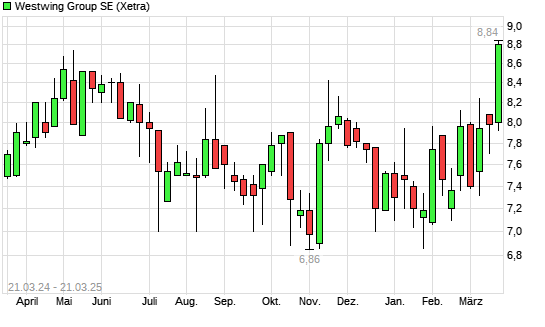 Mit dem Anstieg auf 8,16 EUR hat die Westwing Group-Aktie (ISIN DE000A2N4H07) am 20.03.2025 ein neues 6-Monats-Hoch erreicht und damit den Kurs vom 19.02.2025 eingestellt.