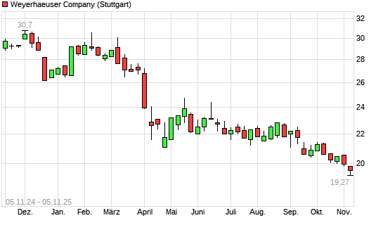 Mit dem Rücksetzer auf 19,37 EUR hat die Weyerhaeuser Company-Aktie (ISIN US9621661043) am 04.11.2025 ein neues 5-Jahres-Tief erreicht und damit den Kurs vom 31.10.2025 eingestellt.