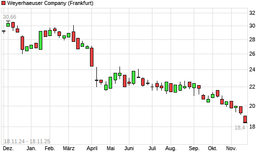 Mit dem Rücksetzer auf 18,80 EUR hat die Weyerhaeuser Company-Aktie (ISIN US9621661043) am 17.11.2025 ein neues 5-Jahres-Tief erreicht und damit den Kurs vom 14.11.2025 eingestellt.