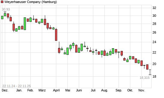 Mit dem Rücksetzer auf 18,39 EUR hat die Weyerhaeuser Company-Aktie (ISIN US9621661043) am 21.11.2025 ein neues 5-Jahres-Tief erreicht und damit den Kurs vom 18.11.2025 eingestellt.