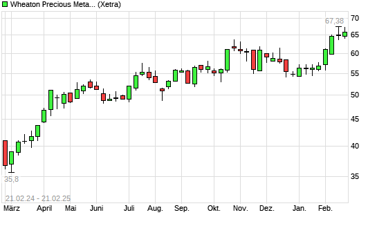 Mit dem Anstieg auf 66,46 EUR hat die Wheaton Precious Metals-Aktie (ISIN CA9628791027) am 20.02.2025 ein neues All-Time-High erreicht und damit den Kurs vom 10.02.2025 eingestellt.