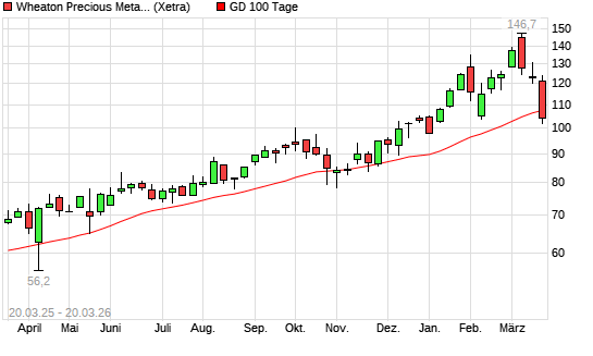 Mit dem Rücksetzer auf 105,25 EUR hat die Wheaton Precious Metals-Aktie am 19.03.2026 die 100-Tage-Linie nach unten gekreuzt.Die Wheaton Precious Metals-Aktie befindet sich seit ...weiterlesen