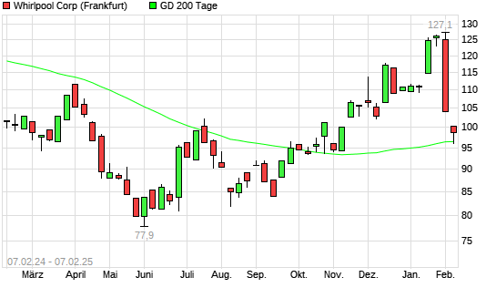 Mit dem Anstieg auf 98,50 EUR hat die Whirlpool-Aktie am 06.02.2025 die 200-Tage-Linie nach oben gekreuzt.