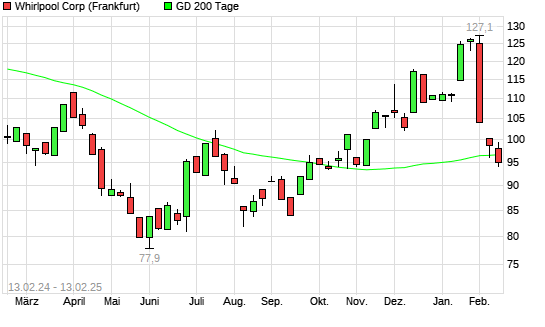 Mit dem Rücksetzer auf 96,50 EUR hat die Whirlpool-Aktie am 12.02.2025 die 200-Tage-Linie nach unten gekreuzt.