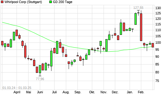 Mit dem Rücksetzer auf 96,58 EUR hat die Whirlpool-Aktie am 28.02.2025 die 200-Tage-Linie nach unten gekreuzt.