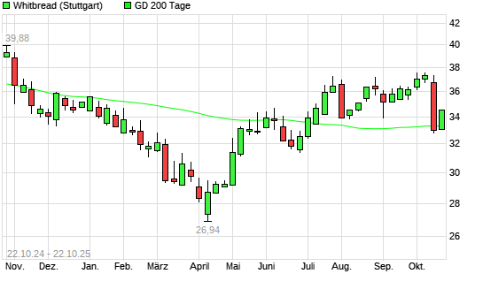 Mit dem Anstieg auf 34,15 EUR hat die Whitbread-Aktie am 21.10.2025 die 200-Tage-Linie nach oben gekreuzt.