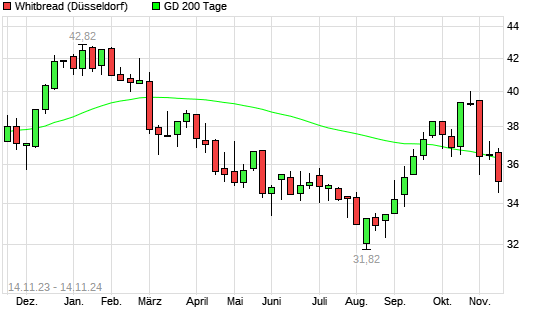 Mit dem Rücksetzer auf 35,81 EUR hat die Whitbread-Aktie am 13.11.2024 die 200-Tage-Linie nach unten gekreuzt.