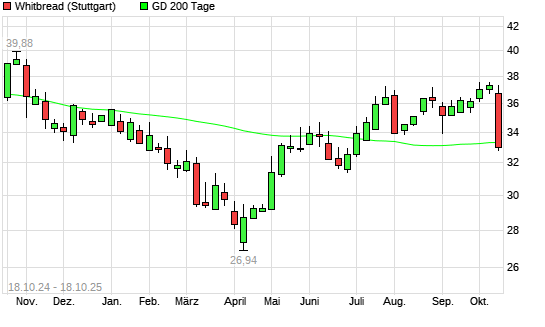 Mit dem Rücksetzer auf 33,19 EUR hat die Whitbread-Aktie am 17.10.2025 die 200-Tage-Linie nach unten gekreuzt.