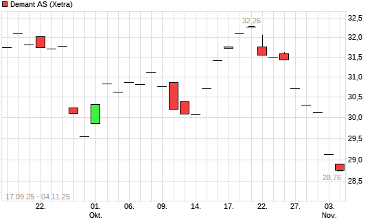 Mit dem Rücksetzer auf 28,62 EUR hat die William Demant Holding A-Aktie (ISIN DK0060738599) am 04.11.2025 ein neues 6-Monats-Tief erreicht und damit den Kurs vom 03.11.2025 eingestellt.