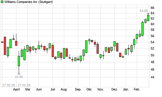 Mit dem Anstieg auf 62,24 EUR hat die Williams Companies-Aktie (ISIN US9694571004) am 26.02.2026 ein neues All-Time-High erreicht und damit den Kurs vom 25.02.2026 eingestellt.