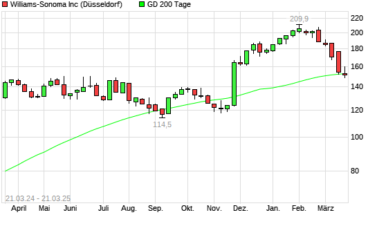 Mit dem Rücksetzer auf 152,30 EUR hat die Williams-Sonoma-Aktie am 20.03.2025 die 200-Tage-Linie nach unten gekreuzt.