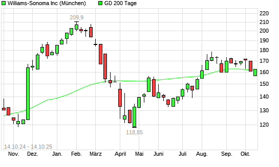 Mit dem Rücksetzer auf 157,25 EUR hat die Williams-Sonoma-Aktie am 13.10.2025 die 200-Tage-Linie nach unten gekreuzt.
