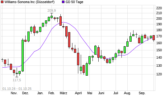Mit dem Rücksetzer auf 162,65 EUR hat die Williams-Sonoma-Aktie am 30.09.2025 die 50-Tage-Linie nach unten gekreuzt.