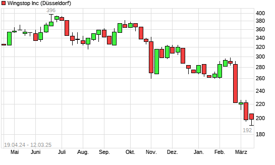 Mit dem Rücksetzer auf 196,00 EUR hat die Wingstop-Aktie (ISIN US9741551033) am 11.03.2025 ein neues 12-Monats-Tief erreicht und damit den Kurs vom 07.03.2025 eingestellt.