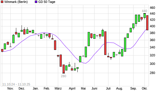 Mit dem Rücksetzer auf 388,00 EUR hat die Winmark-Aktie am 10.10.2025 die 50-Tage-Linie nach unten gekreuzt.