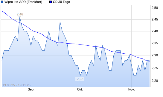 Mit dem Anstieg auf 2,28 EUR hat die Wipro ADR-Aktie am 12.11.2025 die 38-Tage-Linie nach oben gekreuzt.Der Abstand zur 200-Tage-Linie beträgt aktuell -11,22%. ...weiterlesen