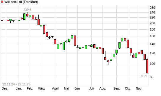 Mit dem Rücksetzer auf 85,94 EUR hat die Wix.com-Aktie (ISIN IL0011301780) am 21.11.2025 ein neues 12-Monats-Tief erreicht und damit den Kurs vom 20.11.2025 eingestellt.