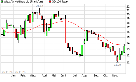 Mit dem Anstieg auf 13,90 EUR hat die Wizz Air Holdings-Aktie am 25.11.2025 die 100-Tage-Linie nach oben gekreuzt.
