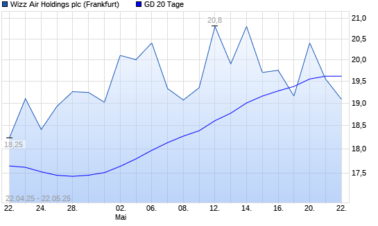 Mit dem Rücksetzer auf 19,55 EUR hat die Wizz Air Holdings-Aktie am 21.05.2025 die 20-Tage-Linie nach unten gekreuzt.