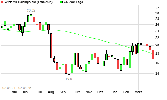 Mit dem Rücksetzer auf 17,50 EUR hat die Wizz Air Holdings-Aktie am 01.04.2025 die 200-Tage-Linie nach unten gekreuzt.
