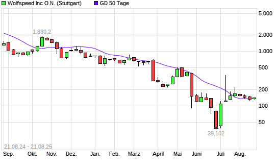 Mit dem Rücksetzer auf 1,12 EUR hat die Wolfspeed-Aktie am 20.08.2025 die 50-Tage-Linie nach unten gekreuzt.