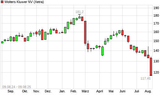 Mit dem Rücksetzer auf 118,55 EUR hat die Wolters Kluwer-Aktie (ISIN NL0000395903) am 08.08.2025 ein neues 12-Monats-Tief erreicht und damit den Kurs vom 06.08.2025 eingestellt.