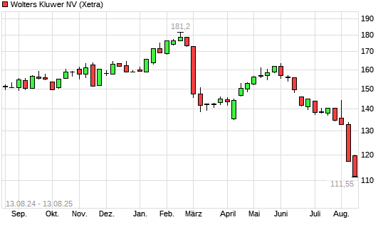 Mit dem Rücksetzer auf 114,50 EUR hat die Wolters Kluwer-Aktie (ISIN NL0000395903) am 12.08.2025 ein neues 12-Monats-Tief erreicht und damit den Kurs vom 11.08.2025 eingestellt.