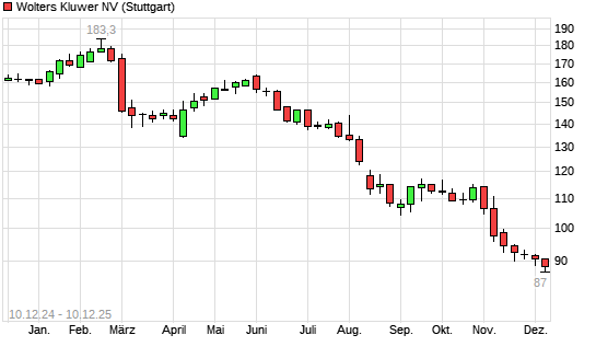 Mit dem Rücksetzer auf 88,82 EUR hat die Wolters Kluwer-Aktie (ISIN NL0000395903) am 09.12.2025 ein neues 3-Jahres-Tief erreicht und damit den Kurs vom 02.12.2025 eingestellt.
