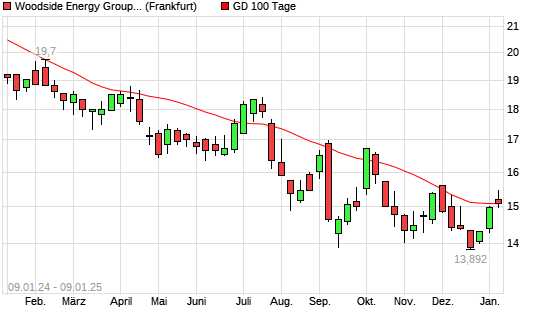 Mit dem Rücksetzer auf 15,00 EUR hat die Woodside Petroleum-Aktie am 08.01.2025 die 100-Tage-Linie nach unten gekreuzt.