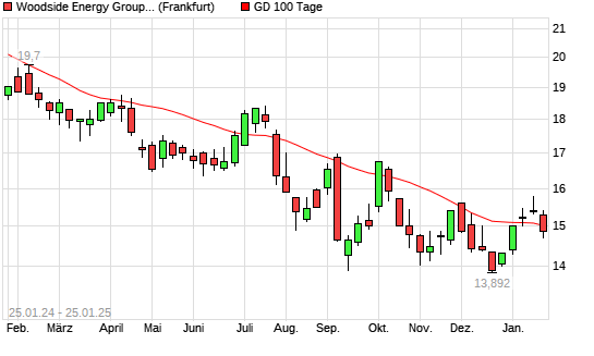 Mit dem Rücksetzer auf 14,86 EUR hat die Woodside Petroleum-Aktie am 24.01.2025 die 100-Tage-Linie nach unten gekreuzt.