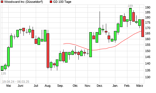 Mit dem Rücksetzer auf 168,00 EUR hat die Woodward-Aktie am 05.03.2025 die 100-Tage-Linie nach unten gekreuzt.