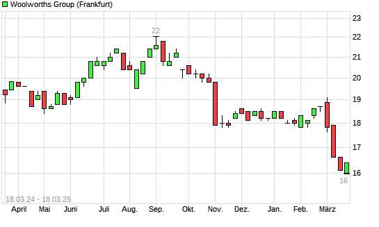 Mit dem Rücksetzer auf 16,00 EUR hat die Woolworths Group-Aktie (ISIN AU000000WOW2) am 17.03.2025 ein neues 5-Jahres-Tief erreicht und damit den Kurs vom 14.03.2025 eingestellt.