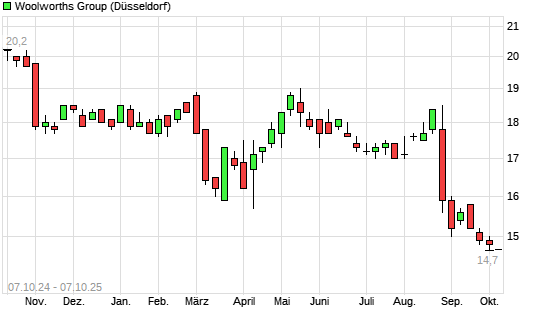 Mit dem Rücksetzer auf 14,80 EUR hat die Woolworths Group-Aktie (ISIN AU000000WOW2) am 06.10.2025 ein neues 5-Jahres-Tief erreicht und damit den Kurs vom 03.10.2025 eingestellt.