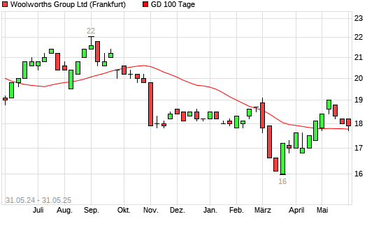 Mit dem Anstieg auf 17,90 EUR hat die Woolworths Group-Aktie am 30.05.2025 die 100-Tage-Linie nach oben gekreuzt.