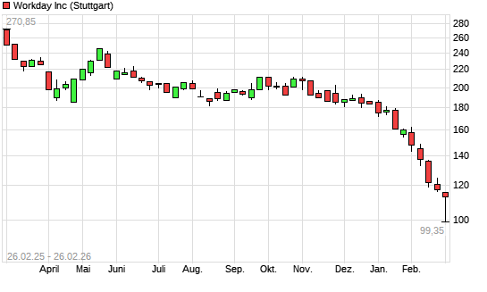 Mit dem Rücksetzer auf 101,10 EUR hat die Workday-Aktie (ISIN US98138H1014) am 25.02.2026 ein neues 5-Jahres-Tief erreicht und damit den Kurs vom 24.02.2026 eingestellt.